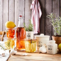 Mit dem Mrs. Winterbottom’s Knoblauchtopf im englischen Vintage Design bringen Sie Ordnung mit System in ihre Küche! Geräumig und stilvoll bietet der runde Behälter mit einem 14 cm Durchmesser genügend Platz für die Knoblauch-Lagerung und das Aufbewahren anderer Vorräte. Der Topf mit Deckel bietet Schutz vor Dreck, lagert alles ordentlich und trocken durch praktische Luftlöcher und passt mit seiner Retro Form perfekt in typische Küchen im modernen oder Landhausstil.