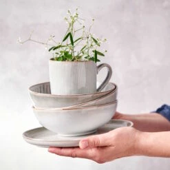 Mit unserer Geschirrserie Native im angesagten minimalistischen Design kommt der neue Trend auf den gedeckten Tisch! Der tiefe Teller aus Steinzeug ist handgefertigt in Portugal und hat eine dünne und hochwertige Scherbe mit einer klaren Formgebung. Durch die reaktive Glasur mit kleinen Kristalleinschlüssen wird jedes Teil der Serie zu einem echten Unikat. Der unglasierte Boden, der das Rohmaterial zum Vorschein bringt, sorgt für einen formvollendeten Manufaktur-Look. Jedes Teil der Serie ist spülmaschinen- und mikrowellengeeignet.
